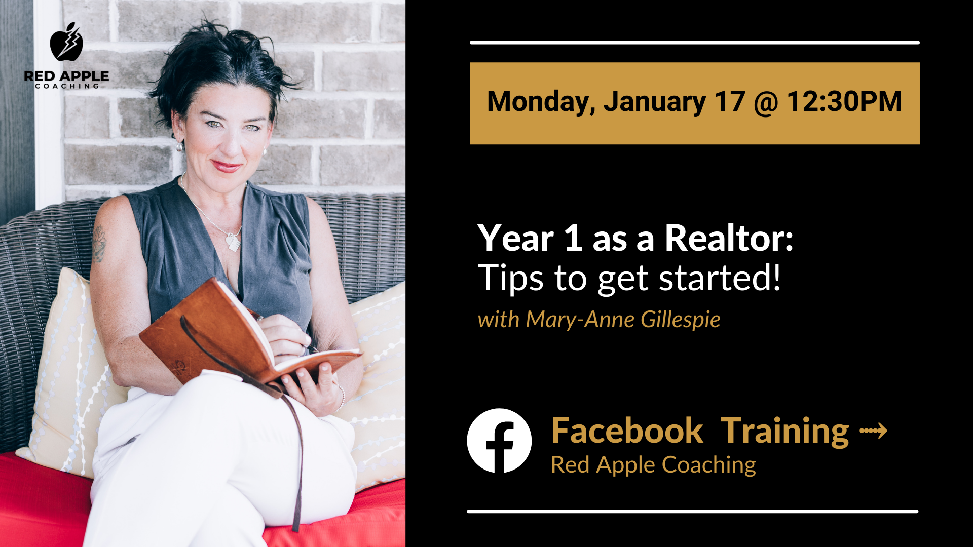 Join Mary-Anne Gillespie, #1 Real Estate Business Coach, for a FREE Live Coaching every Monday on the Red Apple Coaching Facebook page! In this session learn all about: If you want to host a successful webinar: Follow these steps This 30 minute training session, with new topics weekly, will provide you with the best lessons, insights, […]