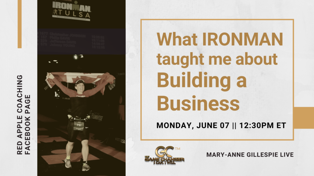 Topic: What Ironman Taught me about Building a Business Join Mary-Anne Gillespie for 30 minutes of Game Changer Facebook Live, weekly on Mondays at 12:30 pm ET Happening at: https://www.facebook.com/redapplecoaching
